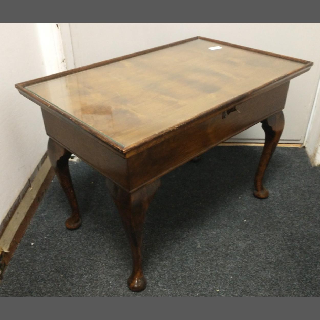 Rectangular wooden occasional table with glass top, storage area and Queen Anne style legs