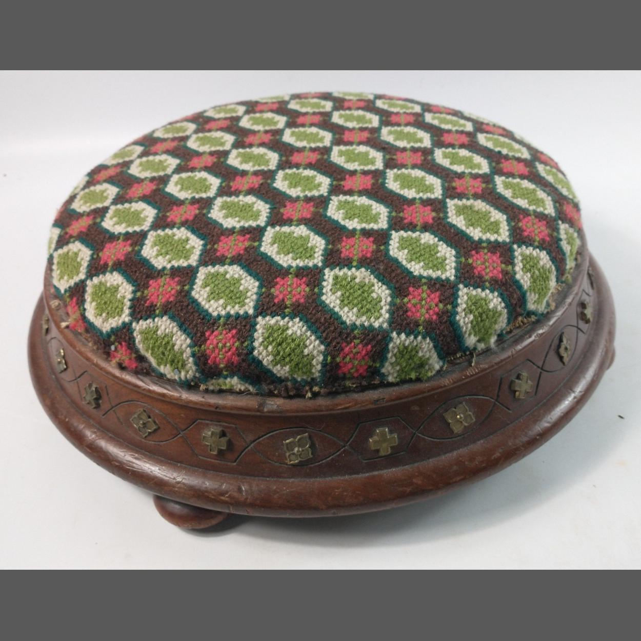 Wooden round footstool with dark green background top and brass coloured symbols around edge