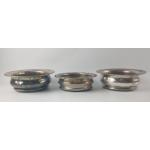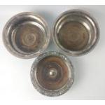 A QUALITY VINTAGE PAIR of white 'metal' wine COASTERS dimensions 18cm diameter x 6.5 depth, combined weight 480g, with also a single highly decorative rimmed 'white metal' COASTER, dimensions 16cm diameter x 5cm depth and 310g weight gross