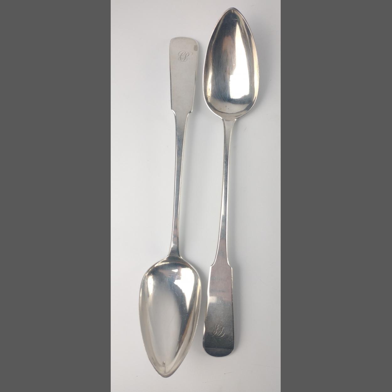 A pair of Scottish EDINBURGH silver hallmarked 1807 BASTING SPOONS, by silversmith WILLIAM CONSTABLE, dimensions 30cm long approx, weight 200g combined.