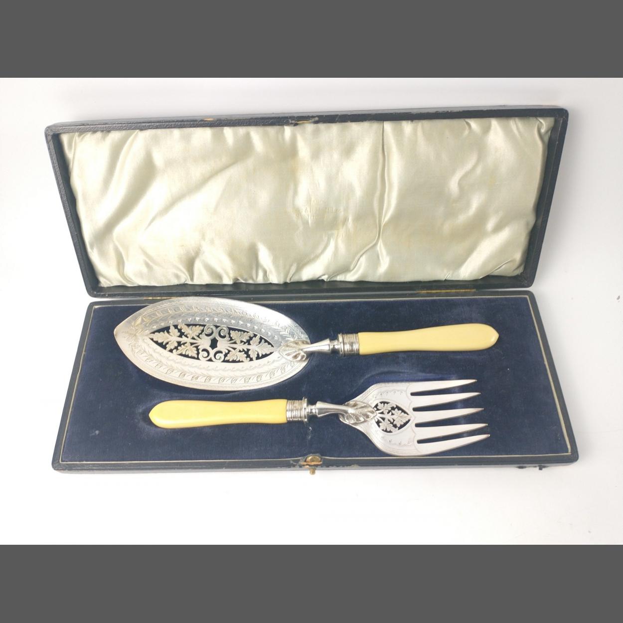 A boxed set of serving FISH KNIFE & FORK Sheffield silver hallmarked collar 1922, bone handled WALKER & HALL in original presentation case.