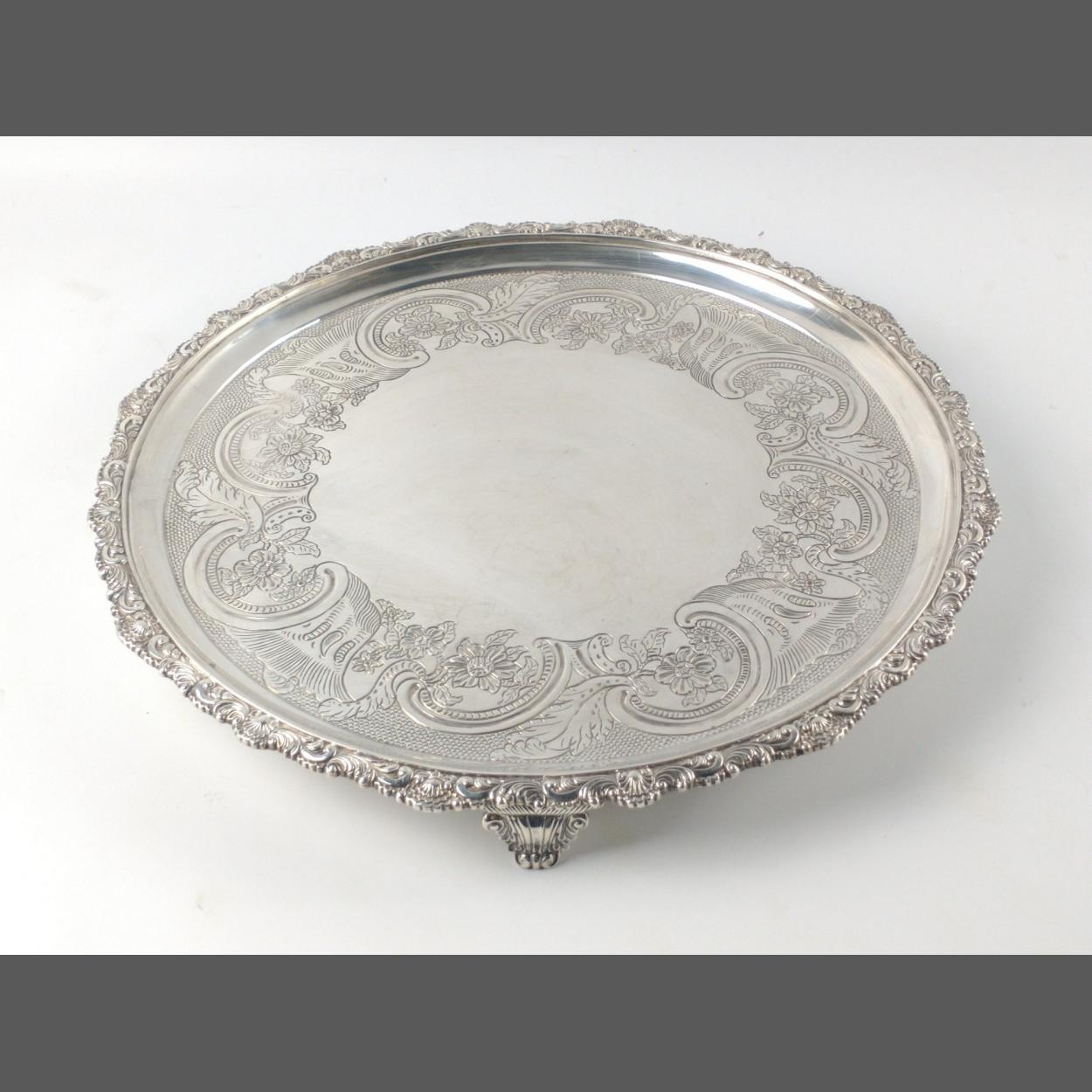 Large silver EDINBURGH hallmarked 1818 TRAY with floral decoration and scalloped edging, by silversmith JW HOWDEN & CO 35.5cm diameter, 1210g weight