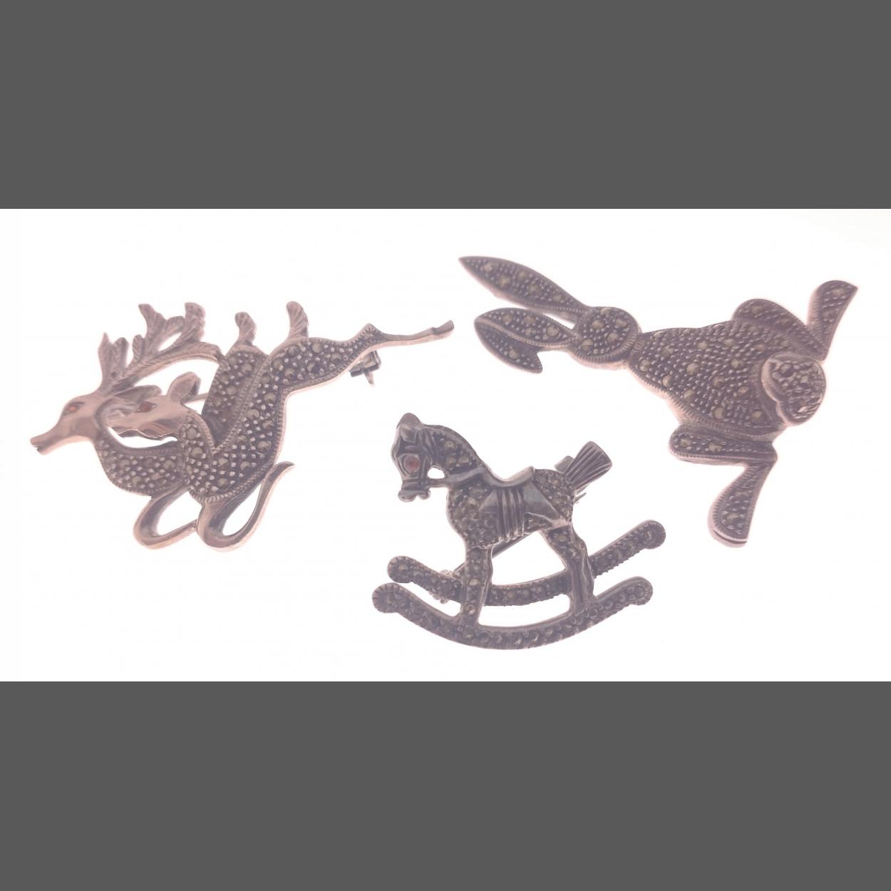 VINTAGE Three nice 925 stamped silver BLING brooches to include a pair of reindeer, a bunny rabbit and a rocking horse - gross weight combined 19.2g