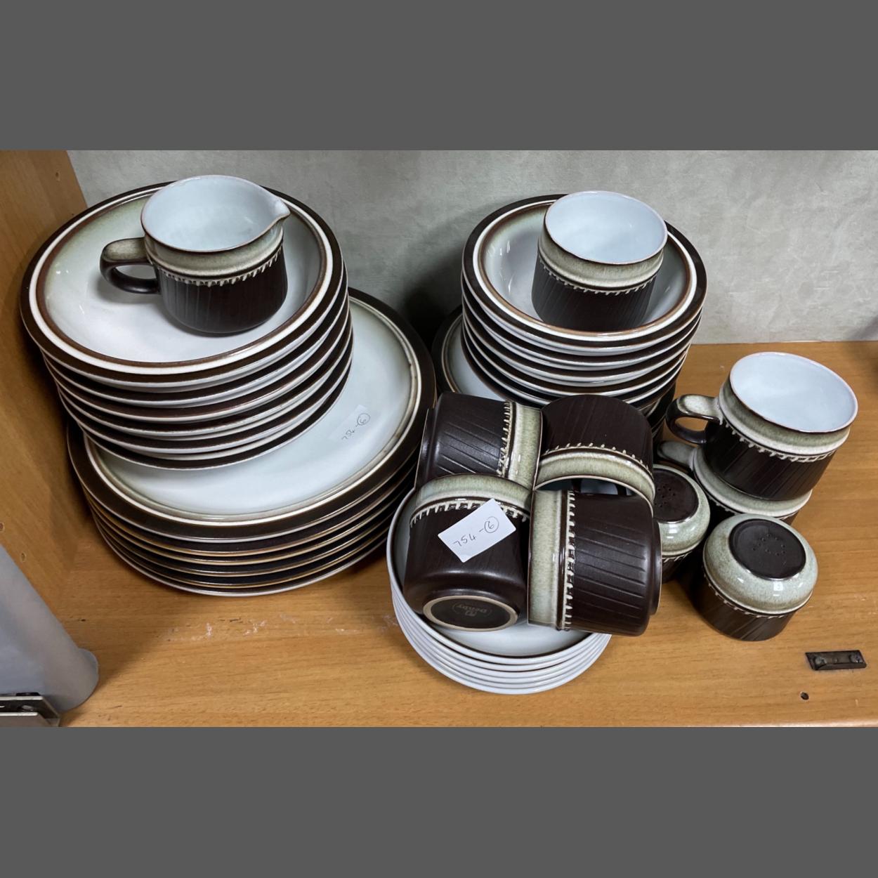 A real vintage DENBY dinner service in the 1970's RONDO pattern comprising 6 plates (26cm), 6 plates (19cm), 6 bowls 19cm), 6 bowls (16cm), 6 saucers (15cm), 6 cups plus 1 milk jug, 1 sugar bowl and 1 each of salt and pepper