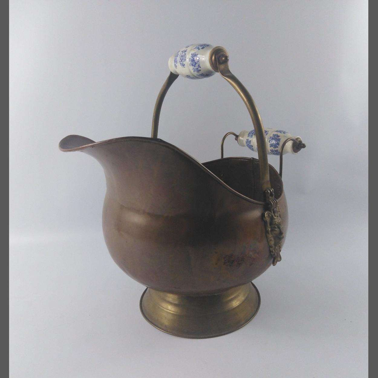 A VINTAGE brass effect COAL SCUTTLE with unusual blue and white china handles with lion figure brackets standing approx 30cm