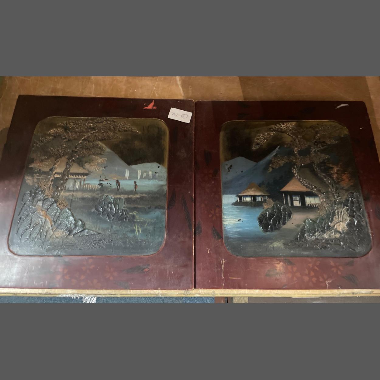Two WOODEN PLAQUES with Oriental beach scenes painted in oils with 3-D effect, plaques measure 30 x 30cm, (slight crack in one plaque)