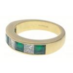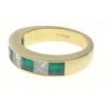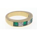 A SUBSTANTIAL 750 hallmarked yellow gold RING size O/P set with four large cut EMERALDS 4mm length approx and three large cut DIAMONDS 4mm length approx carat measurement is .33 approx -the colour appears white with no inclusions visible to the naked eye, and no noted inclusions by 10 magnification loop - gross weight 8.45g -