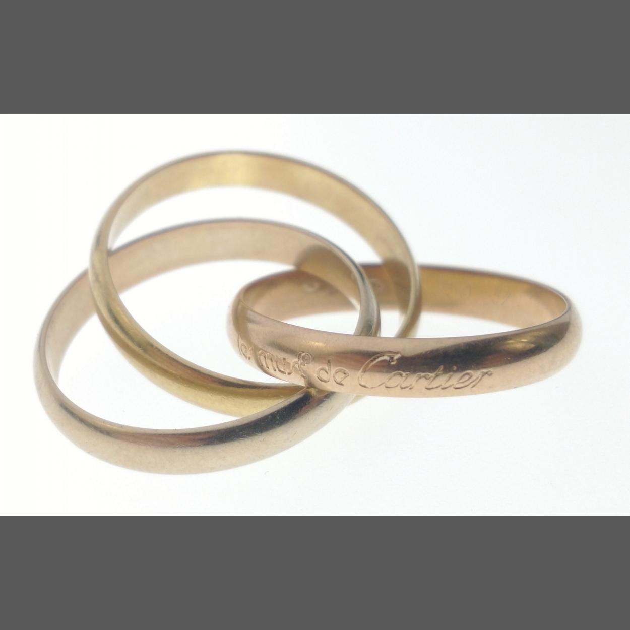 Les Must De Cartier stamped Trinity 750 stamped yellow white rose gold RING Size N weight 9.32g approx within a CARTIER blue pouch