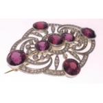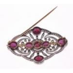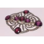 ORNATE STUNNING ART DECO DESIGN! An unmarked diamond and garnet set BROOCH, with 7 round faceted garnets, each measuring 9mm round approx, with 102 small round diamonds - the metal is valued as platinum and 18 carat yellow gold - gross weight 21g and dimensions 5cm x 4cm approx -