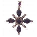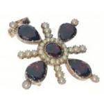 A VICTORIAN 'yellow metal' PENDANT in star shape form, with 4 large garnets 1cm in length, and with a 5th garnet centred and 7mm diameter, all surrounded by small pearls (one pearl missing), with a further pinkish garnet set on a linkage to the pendant - gross weight 8g and length 5cm approx