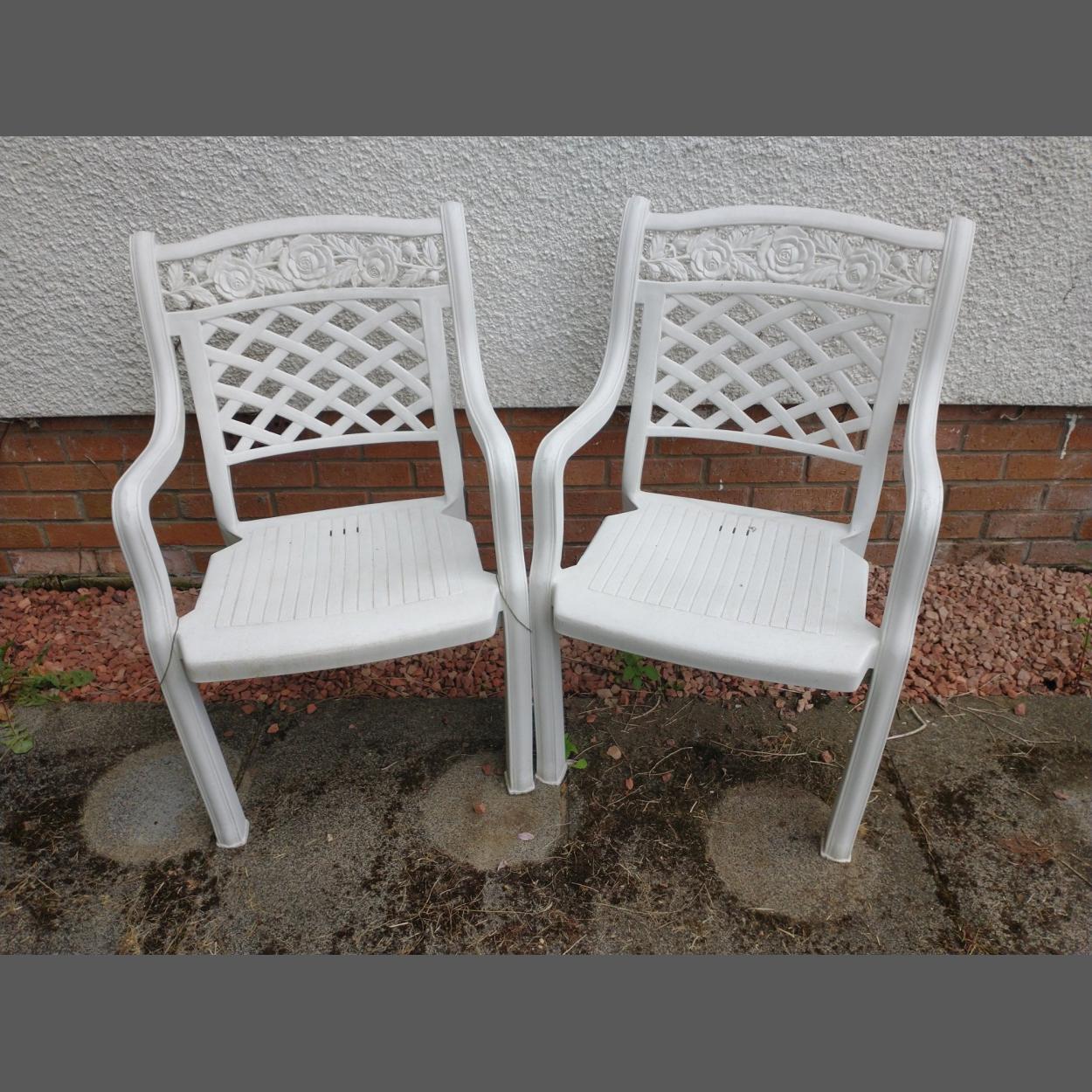 Pair of plastic garden chairs with nice lattice work back and rose design