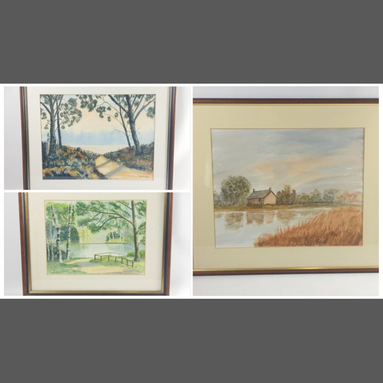 Three ORIGINAL WATERCOLOURS by artist GORDON LANGLEY to include a woodland scene and pathway, framed and mounted 46cm x 35cm, A Countryside river and cottage scene, framed and mounted 48cm x 38cm and lastly a countryside woodland and river scene painted in lush green colours, 31cm x 23cm.