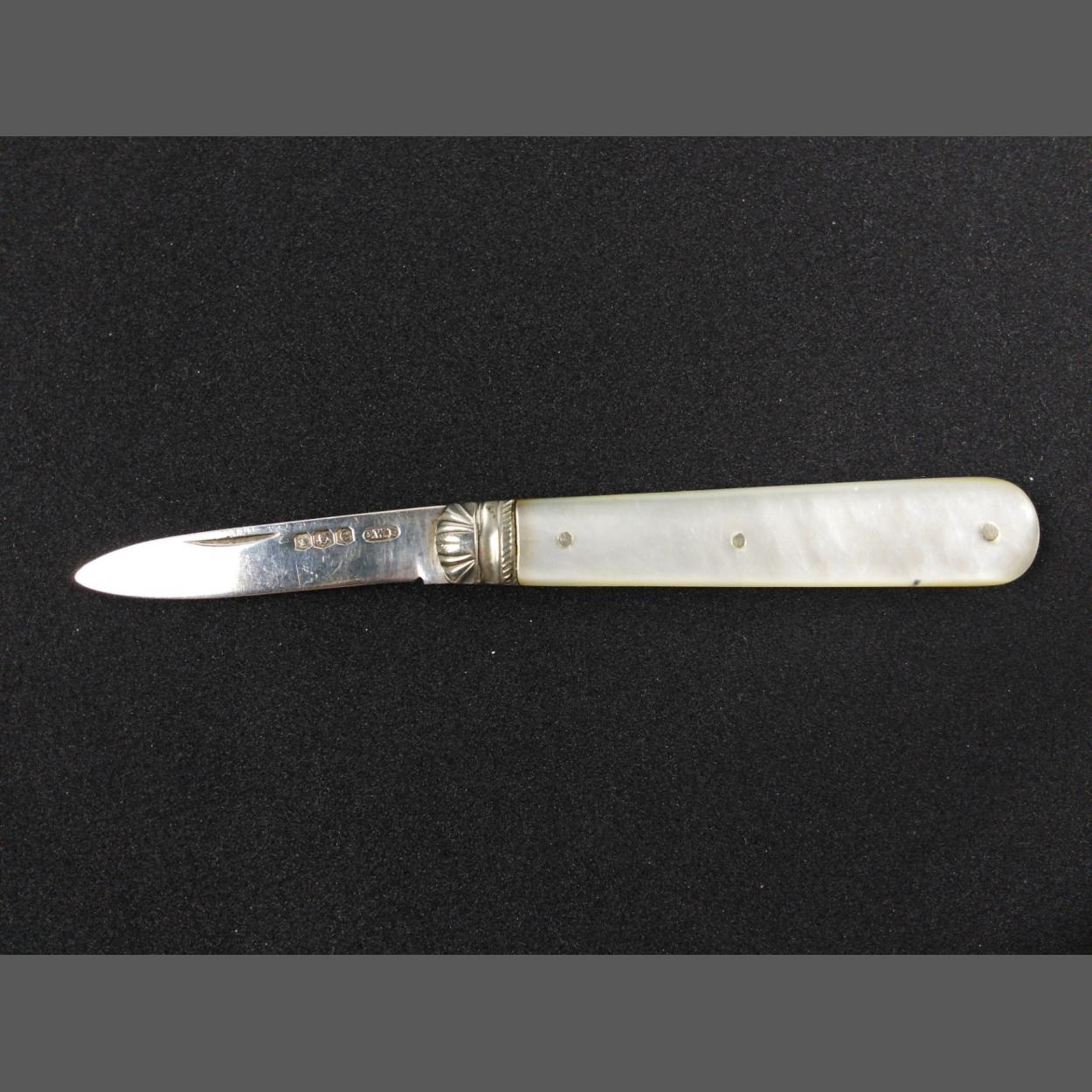A FRUIT KNIFE with a mother-of-pearl handle and silver hallmarked blade CW Fletcher Sheffield 1922
