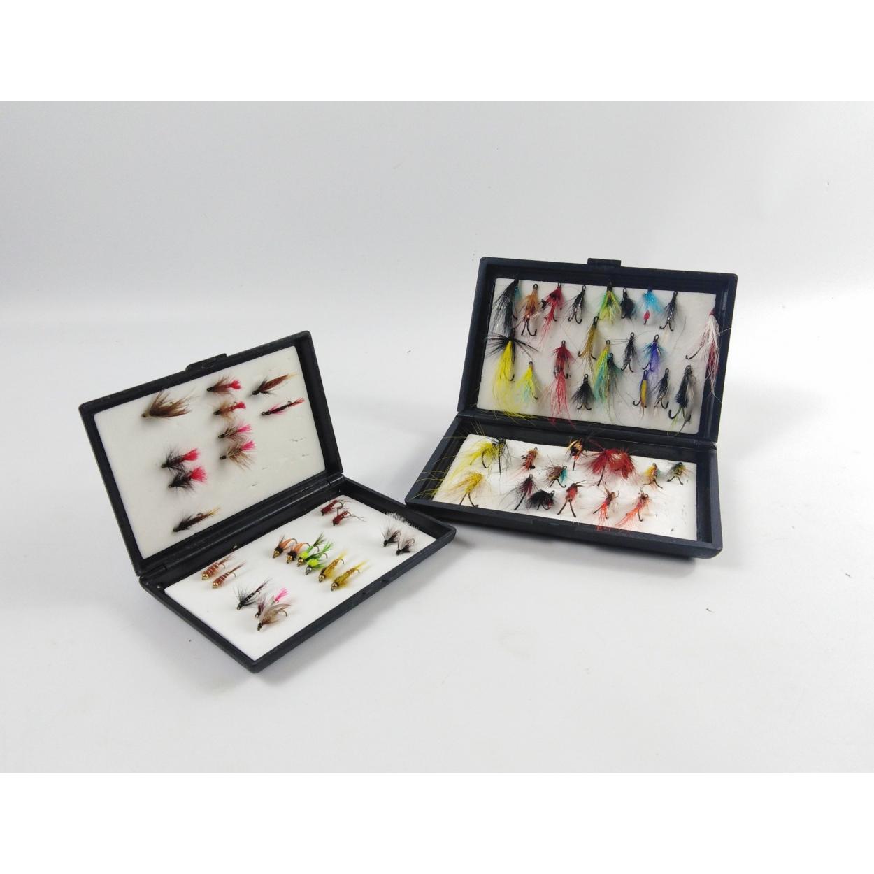 A black FLY BOX around 30 mainly double-hooked salmon flies plus another small flybox of 25 flies and nymphs