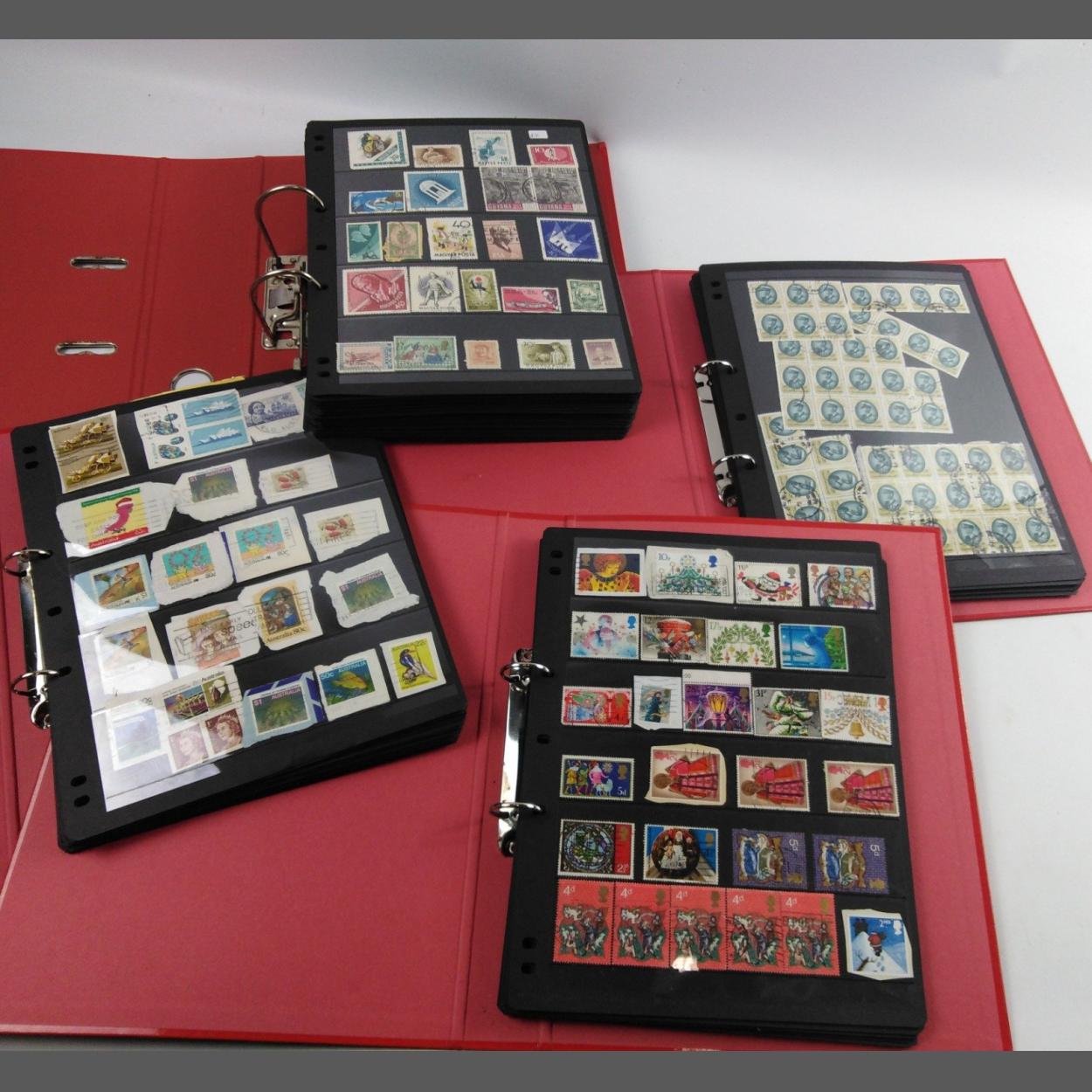 Four red folders FULL of hundreds collectable stamps to include Christmas collection, mixed world stamps, a large Netherlands Australia and New Zealand collection etc
