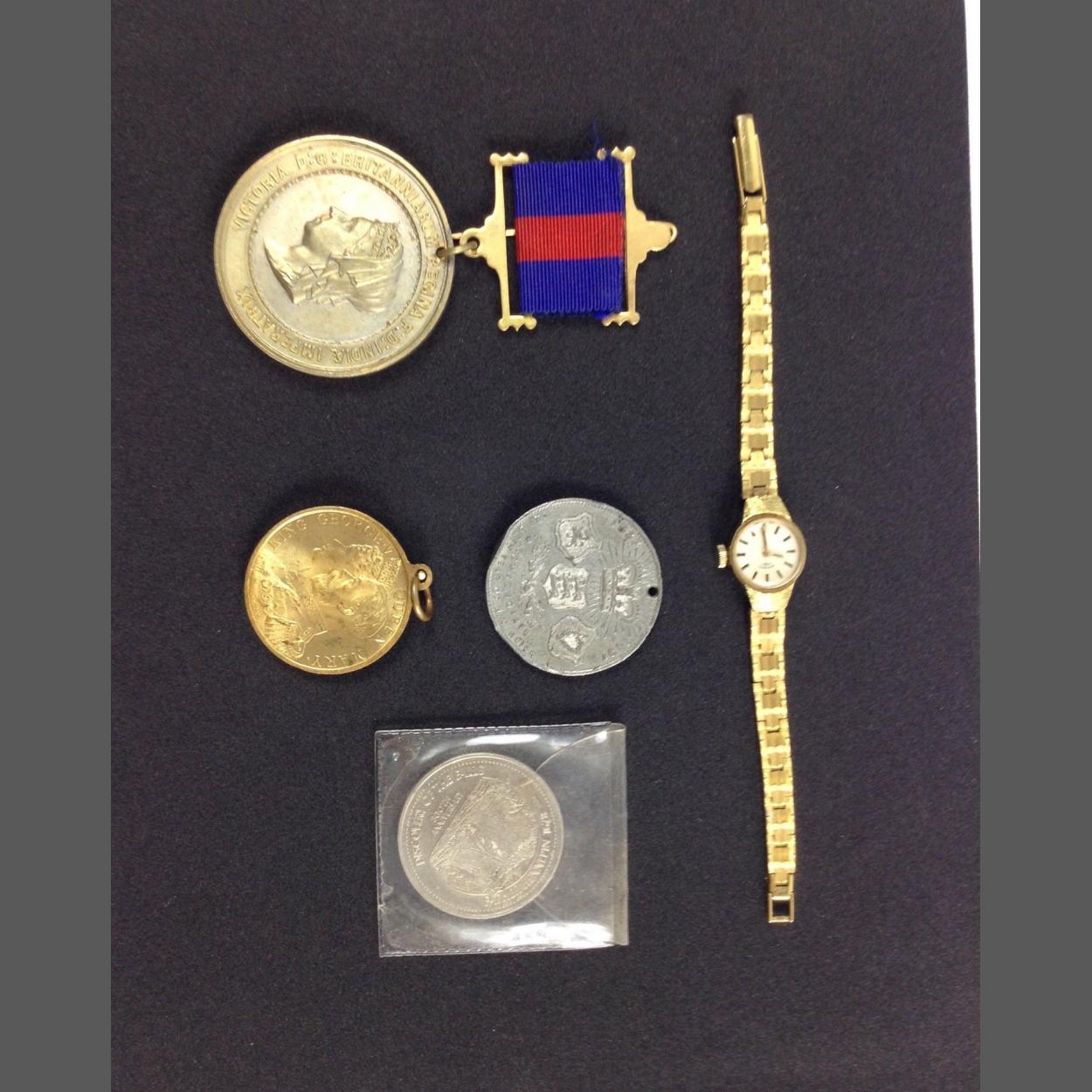 A small collection of COMMEMORATIVE MEDALS to celebrate QUEEN VICTORIA'S 50th and 60th anniveraries, a CANADIAN TRADE DOLLAR in commemoration of the 300th anniversary of the discovery of NIAGARA FALLS and a RISHTON COUNCIL medal to commemorate the coronation of GeorgeV and Queen Mary plus a Rotary watch presented to Mary Hooley for 25th years service at British Trimmings