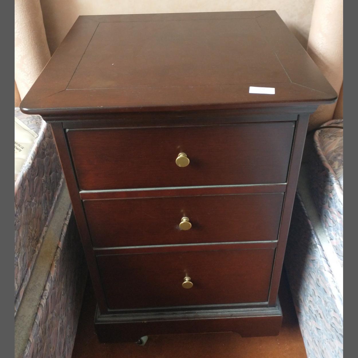 Dark wood STURDY STAGG style chest of 3 drawers on wheels, label on back by McDONAGH