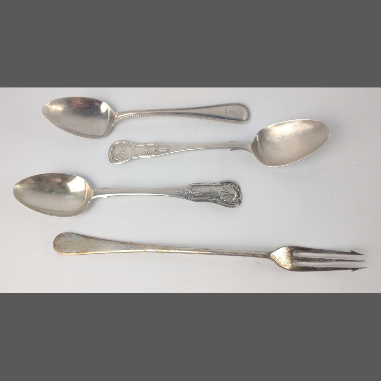 Four pieces of Scottish hallmarked silver to include a 1881 GLASGOW TEASPOON by silversmith T. SMITH & SONS, an 1876 EDINBURGH teaspoon by silversmith MACKAY, CUNNINGHAM & CO, and a 1856 EDINBURGH teaspoon by silversmith JAMES WRIGHT, and a 1996 EDINBURGH PICKLE FORK by silversmith ALAN R BAILLIE, gross weight 80g.