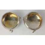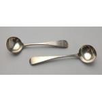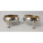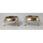 A pair of London hallmarked silver SALTS, hallmark indistinct, marked to base of feet initials A,C and 1751 diameter 7cm, height 4cm, and a pair of SALT SPOONS hallmarked London 1819, length 9cm, gross weight 140g.