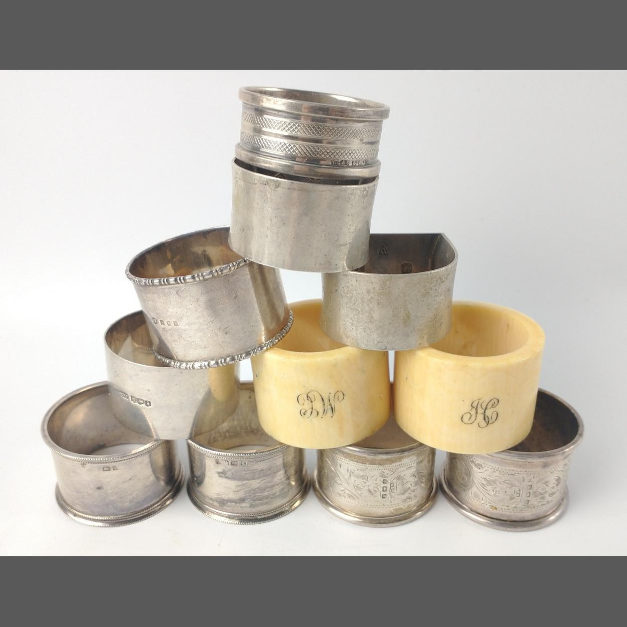 A collection of eleven NAPKIN RINGS to include 2 Birmingham 1925 silver hallmarked by silversmiths ROLSAN BROS, 2 Birmingham 1918 silver hallmarked by silversmiths CHARLES S GREEN & Co LTD, 1 silver hallmarked Birmingham 1931 by silversmiths HENRY GRIFFITH & SONS LTD, 1 London silver hallmarked 1918, 1 Sheffield silver hallmarked 1918, 2 EDINBURGH silver hallmarked 1988 and also 2 bone rings, gross weight for silver 215g.