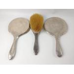 Two Birmingham silver hallmarked DRESSING TABLE MIRRORS one by silversmith JAMES FENTON Birmingham 1922, the other by silversmiths W G SOUTHERS & CO, Birmingham 1915 and a Chester hallmarked 1929 dressing table HAIRBRUSH by silversmith ROBERT PRINGLE, mirrors length 28.5cm, brush length 15.5cm, gross weight 809g.