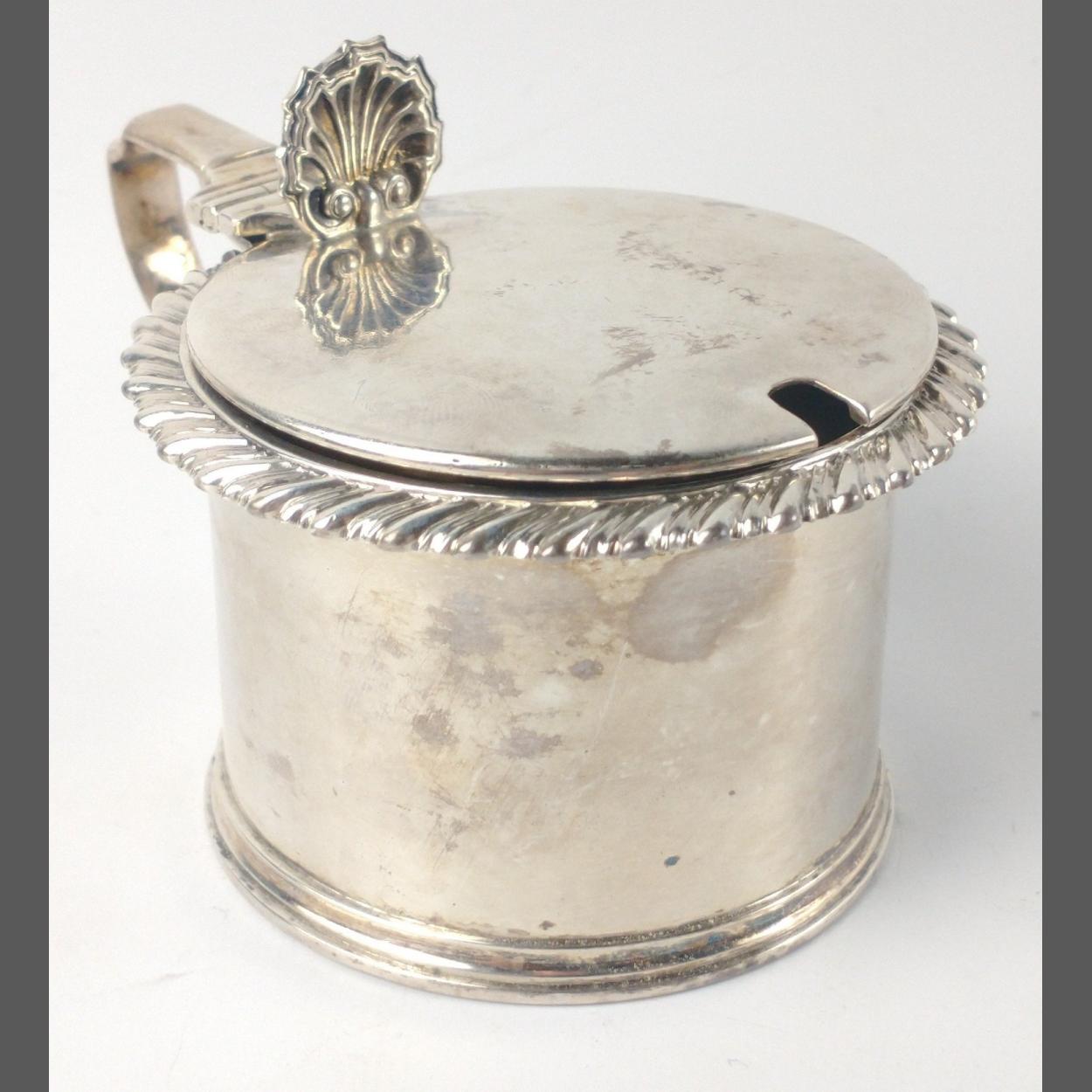 A London silver hallmarked 1832 MUSTARD POT with clear glass liner, 5cm x 7.5cm diameter, 134g silver weight only