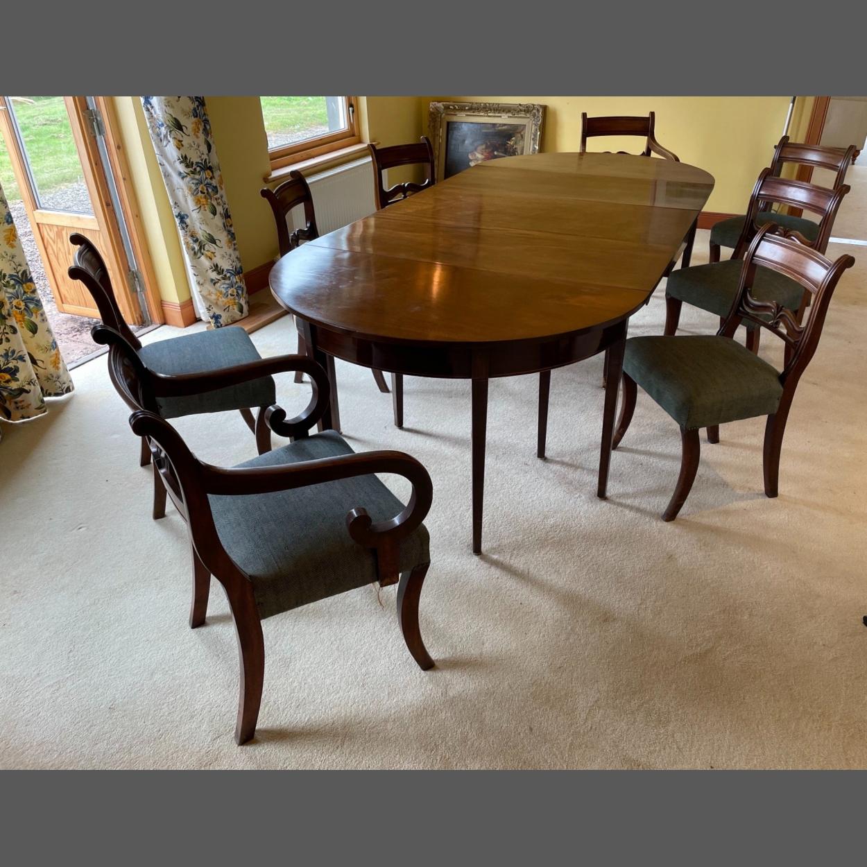 AN ANTIQUE mahogany D- ended sectional DINING TABLE dimensions 9ft x 4ft( table has gate-leg support legs to support the centre leaves) with also 6 dining chairs and two carvers