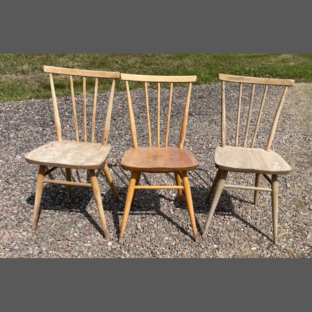 Three classic ERCOL DINING CHAIRS, one is slightly faded