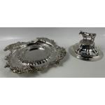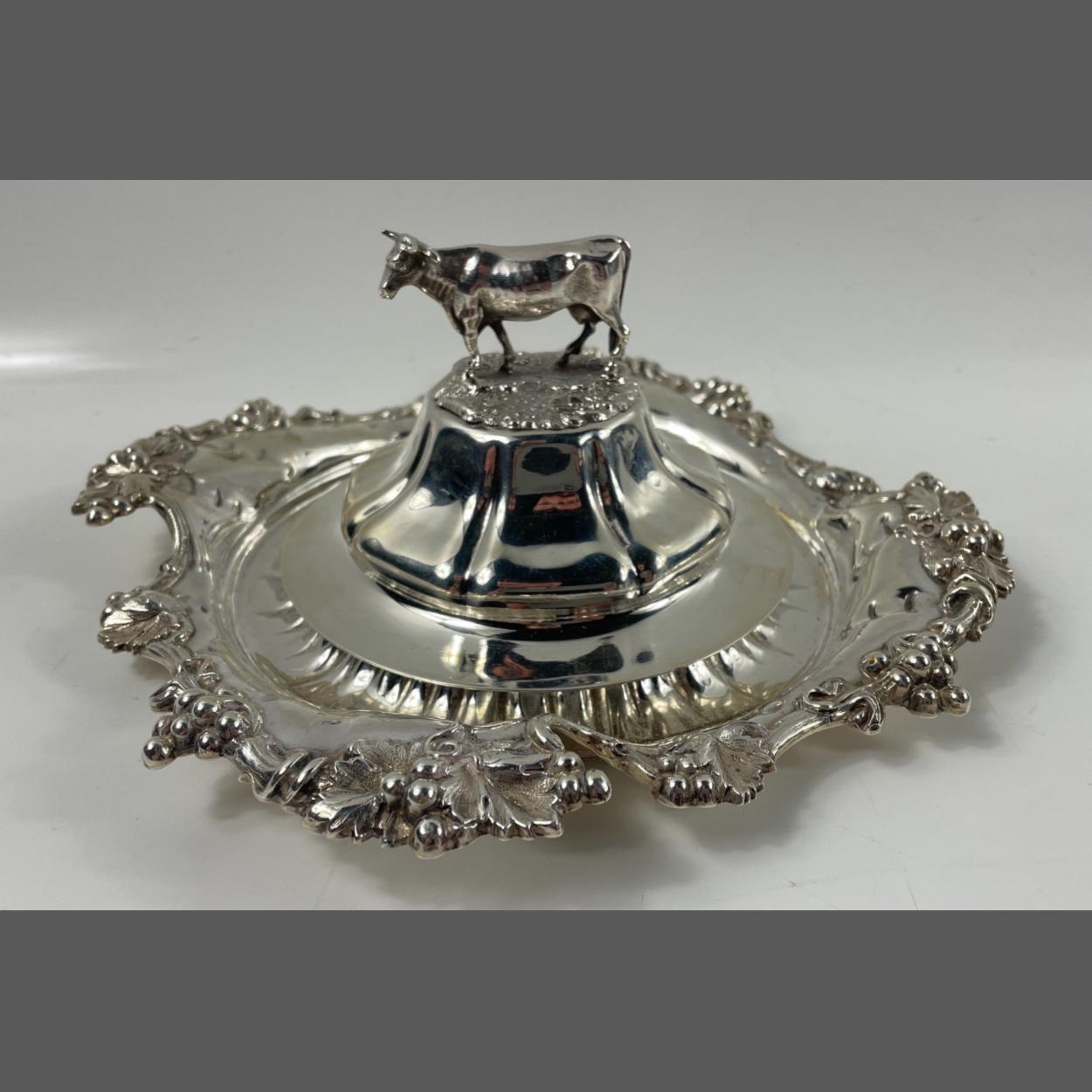 A silver hallmarked Sheffield 1835, butter tray and lid with bovine finial by silversmith HENRY WILKINSON & CO, liner missing, base 23cm diameter, lid 8cm x 12.5cm diameter, gross weight 520g.