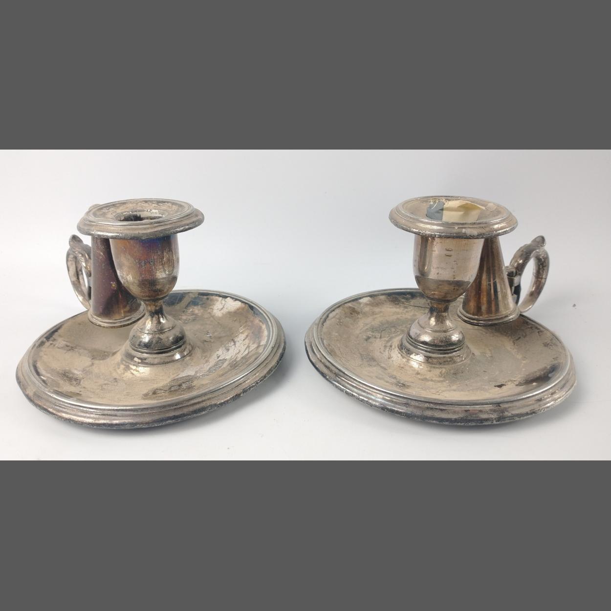 A pair of Sheffield WALKER & HALL Wee Willie Winkie CANDLE HOLDERS with candle SNUFFERS 14.5cm diameter by 8cm high, gross weight 759g