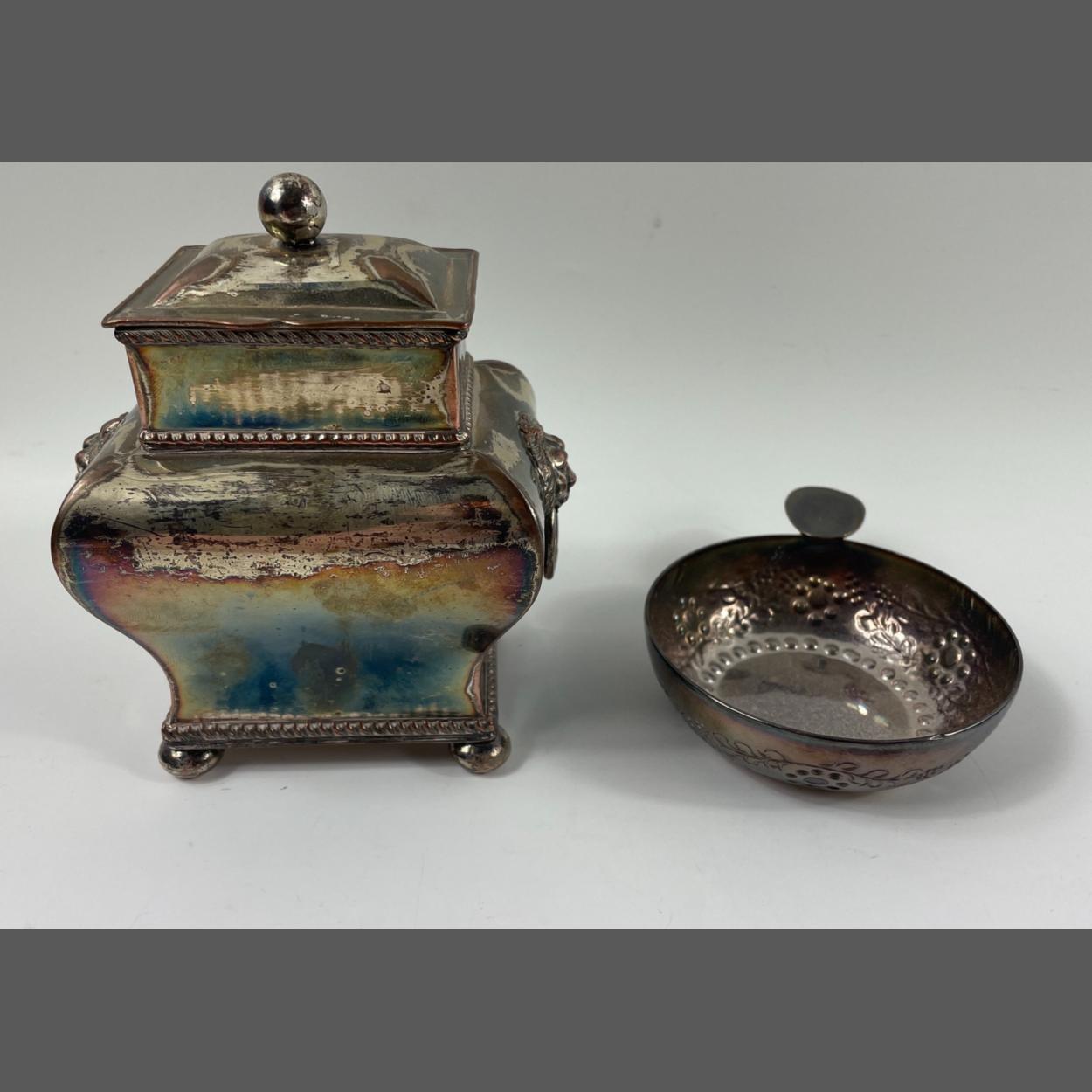 A white metal TEA CADDY 12cm x 10cm x 7.5cm plus a Sheffield WINE SOMMELIER'S CUP 8.5cm diameter, gross weight 430g.
