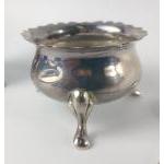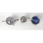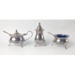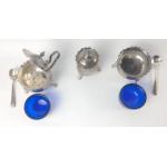 A Dublin silver hallmarked 1973 CRUET SET comprising pepper, mustard and salt (salt and mustard have blue glass liners), by silversmith ROYAL IRISH SILVER COMPANY and 2 matching spoons silver only weight 254g