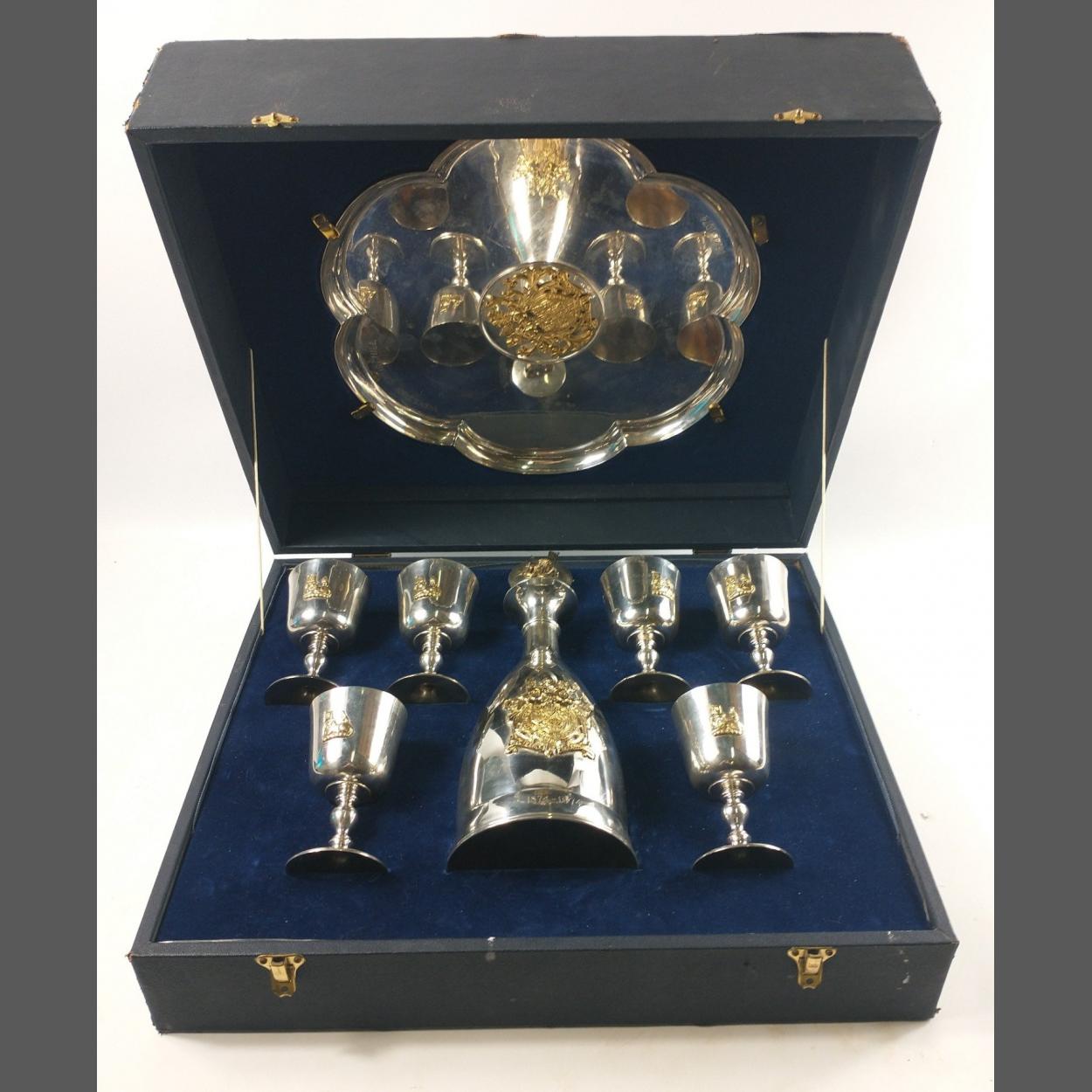 RARE!! A COMPLETE SET OF SIR WINSTON CHURCHILL CENTENARY 1974 by MAPPIN and WEBB, Limited Edition No 6/100 fully hallmarked solid silver and silver gilt cased set comprising a large TRAY, DECANTER with SIX GOBLETS with a combined silver content of 3.37kg.applied with Sir Winston's coat-of-arms within garter surround above Churchill motto Fiel Pero Desdichado (Faithful but unfortunate), inscribed 1874-1974, numbered 6, stopper applied with the Churchill crest, vase-shaped cups similarly applied with the Churchill crest on circular bases with baluster stems, inscribed Winston Churchill Centenary 1874-1974, in original Mappin & Webb fitted case also stamped with the Churchill coat-of-arms and crest, including the parchment authentication from the Churchill Centenary Trust signed by Clementine Churchill