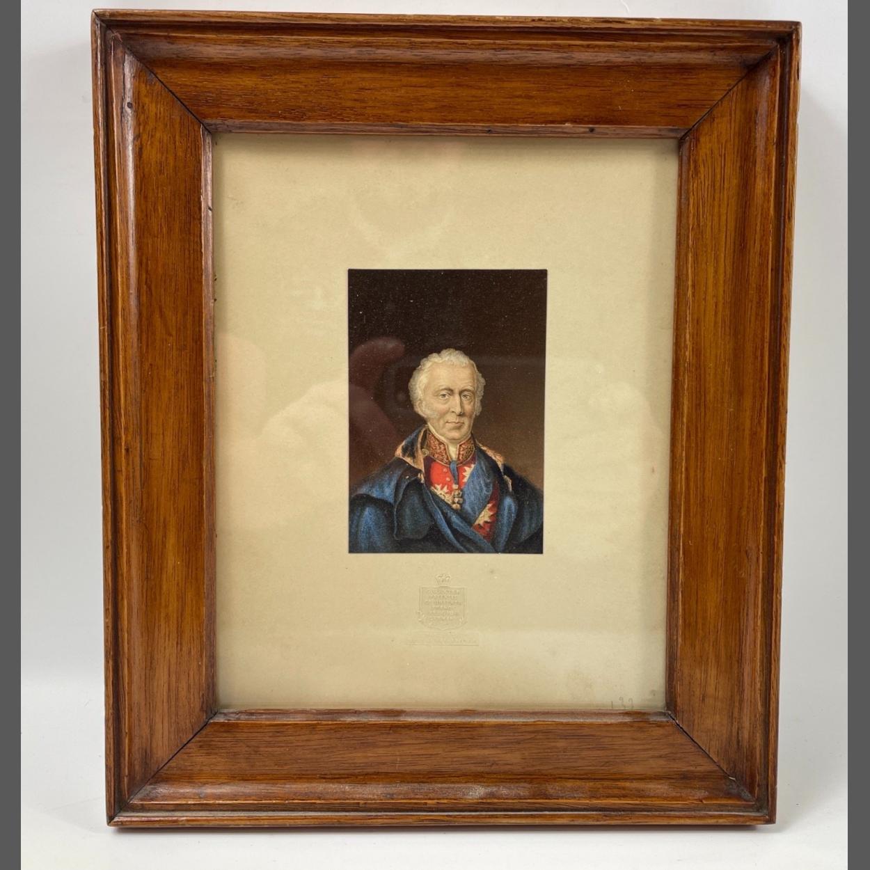 An ANTIQUE framed portrait of the late Duke of Wellington, paper embossed by G BAXTER PATENTEE OF Britain, France, Belgium, Germany, picture size 9.5 x 7cm, frame size 26 x 22cm