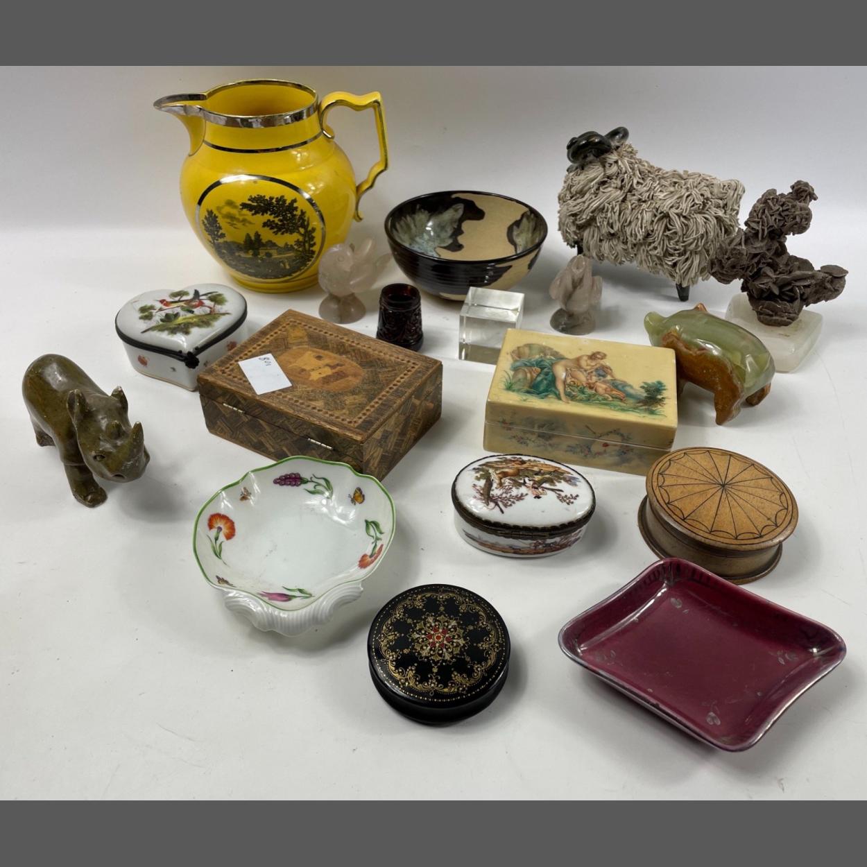 A QUALITY! mixed lot to include a LIMOGES TRINKET DISH 10cm dia, plus various vintage trinket boxes, animal figurines, cane top etc