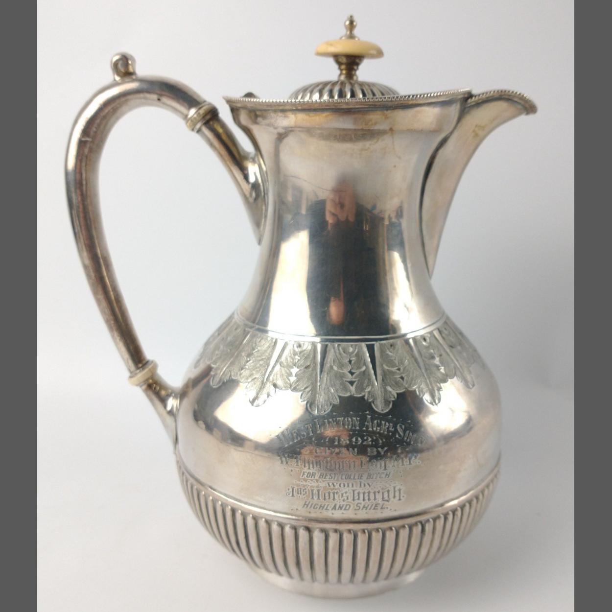 1892 West Linton prize lidded (3527) WB&Co EP WATER JUG with bone finial dimensions 11.5cm high x 18cm wide, weight 805g
