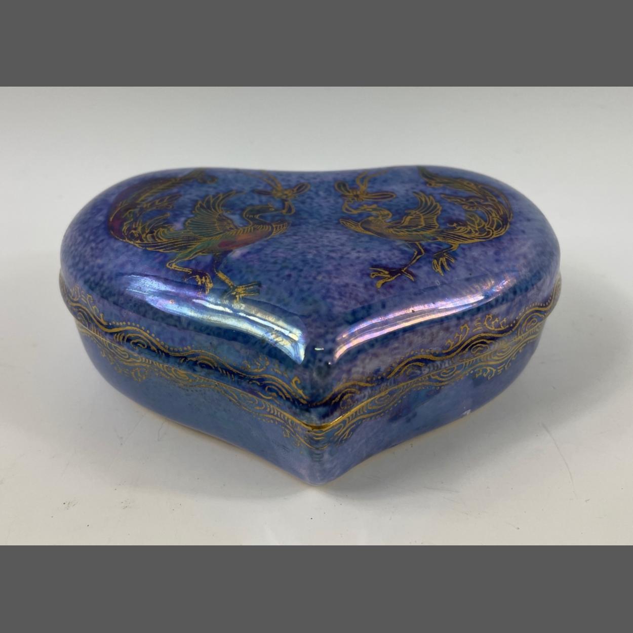 A vintage 1920s Wedgwood bird lustre heart-shaped TRINKET BOX. Mottled blue exterior, with two exotic birds on the cover. Gilt aquatic bead around the rim of both pieces. Mother of pearl interior with two birds. Wedgwood 'Portland Vase' maker's mark to underside of box along with pattern number 'Z4829'. length 13cm, height 5cm