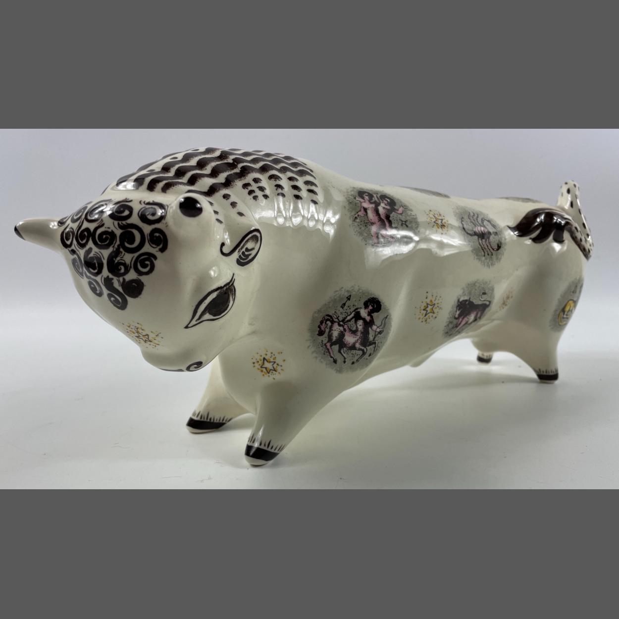 The iconic TAURUS THE BULL from Wedgwood's Queensware range, modelled by Arnold Machin, the Zodiac designs possibly by Eric Ravilious or/and Eric Fraser dating from mid 20th century length approx 39cm, height approx 18cm