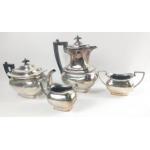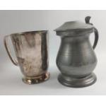 A HANDSOME WALKER & HALL nice quality tea and coffee service to include coffee pot tea pot cream and sugar with also a large WALKER & HALL tankard 12,5cm tall x 9.5cm with also a pewter lidded tankard 15cm height