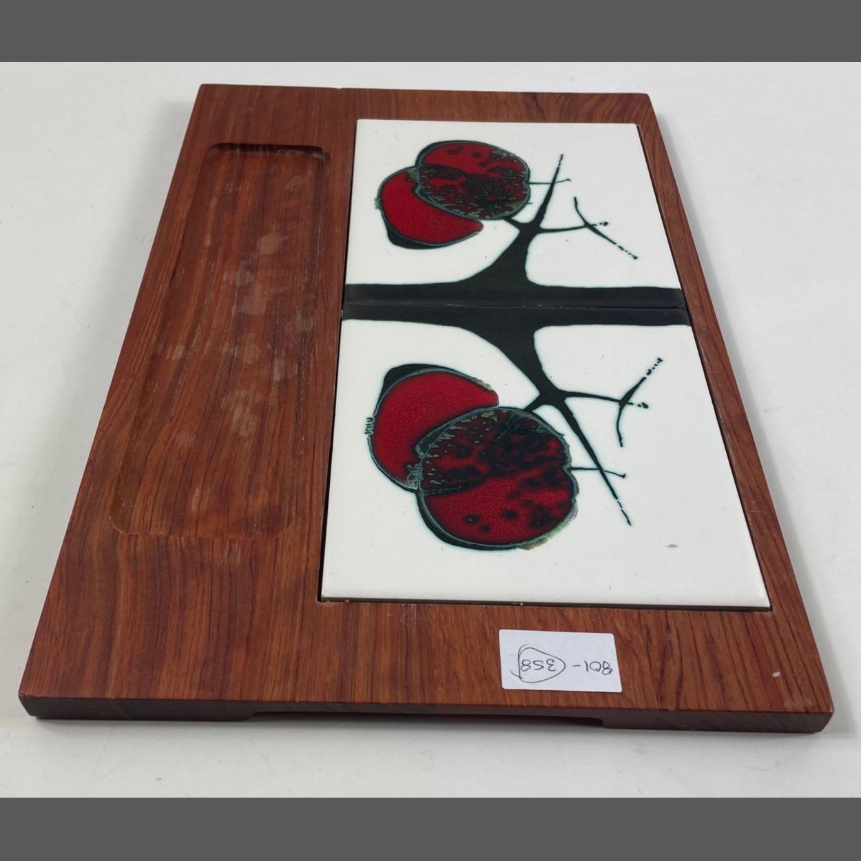 A wooden CHEESEBOARD with 2 pomegranate- decorated tiles and scooped out space for knives etc 38cm x 26cm