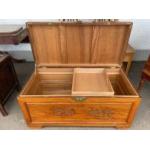 An ORIENTAL camphor style wooden lidded chest with brass fittings dimensions 100cm length x 48cm width x 50cm height ( a nice quality clean chest)