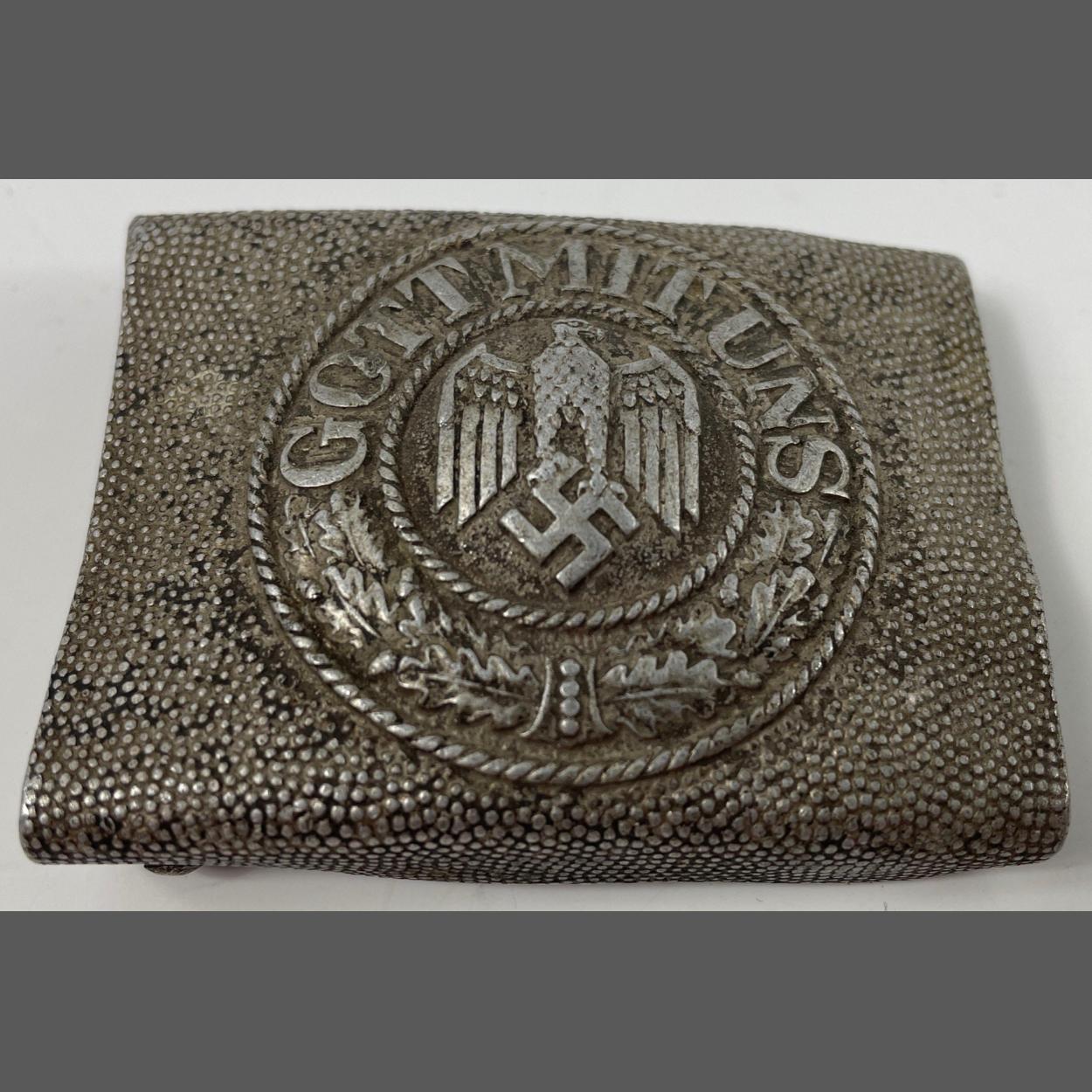 Genuine WW2 German “Wehrmacht” (army) “GOTT MIT UNS” belt buckle with Wehrmacht Eagle in Aluminium with patinated finish & working belt swivel teeth for leather belt, in good used condition. 6.5cm x 5cm