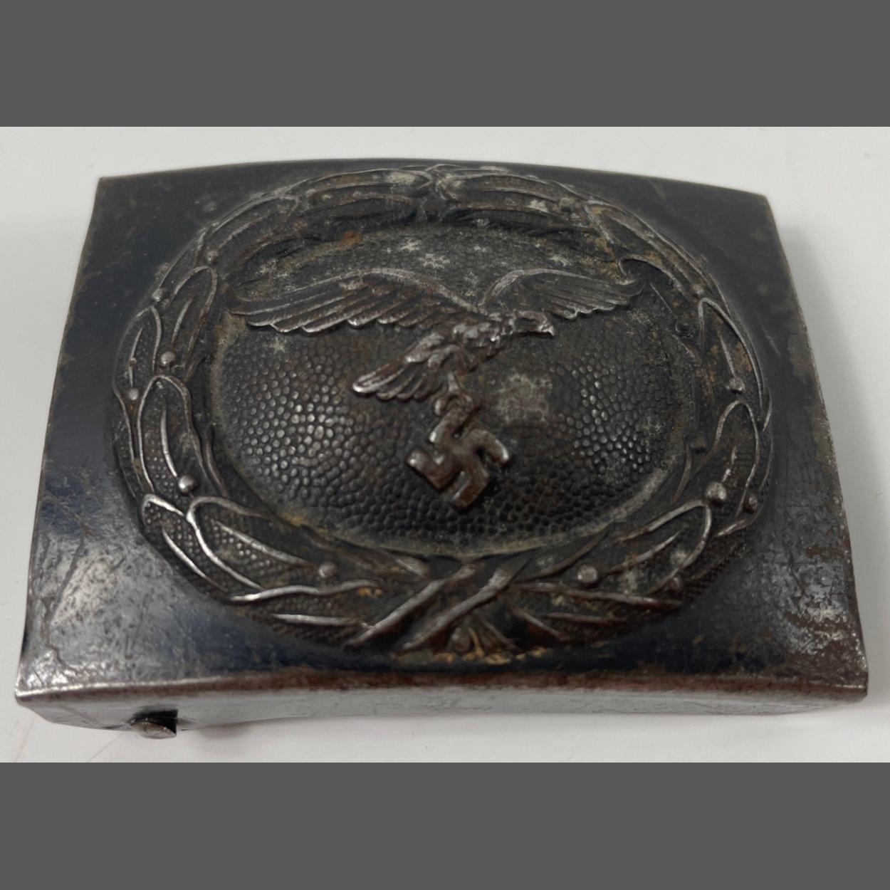 Genuine German WW2 Luftwaffe (airforce) Belt Buckle with Luftwaffe Eagle emblem, near complete Black “Japanning” or paint, excellent used condition with working swivel teeth for leather belt. 6.5cm x 5cm