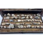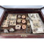A VICTORIAN collection c1870's flint stone arrow heads, ammonites, Hag Stones, an early copper/bronze buckle? etc etc, a great collection all within a nice quality mahogany glazed display case with a second pull-down drawer layer 56cm x 38cm x 23cm
