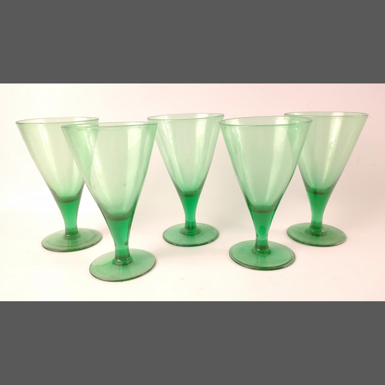 FIVE handmade vintage green drinking glasses c1930's