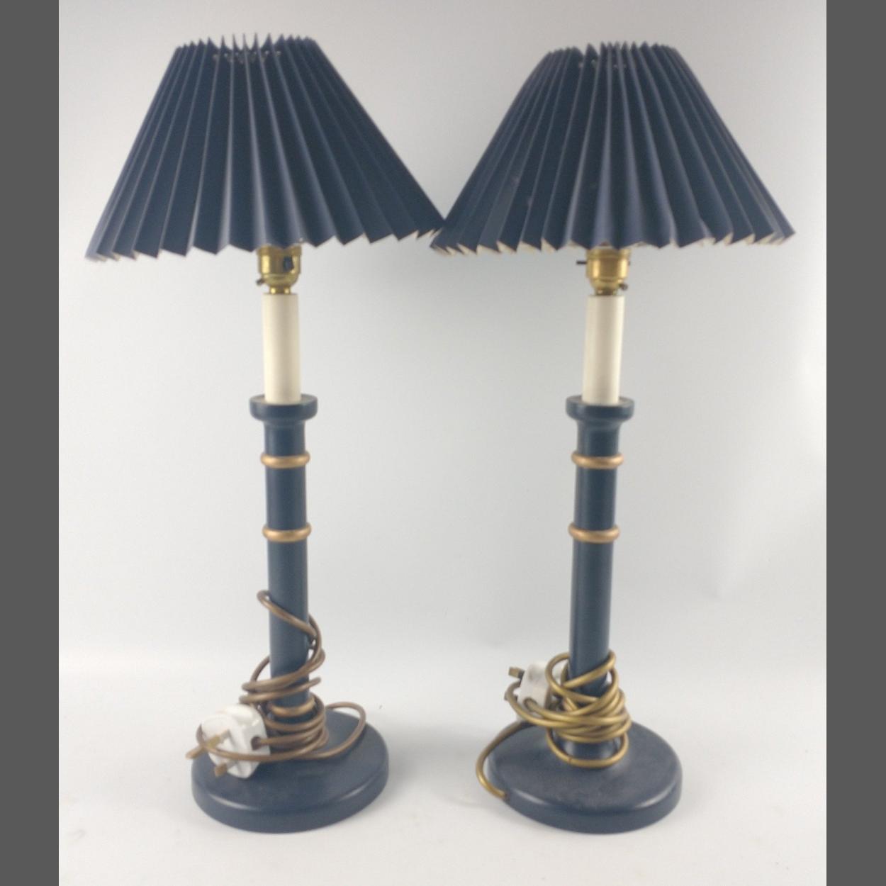 A pair of navy blue candlestick TABLELAMPS with pleated navy shades standing approx 53cm tall