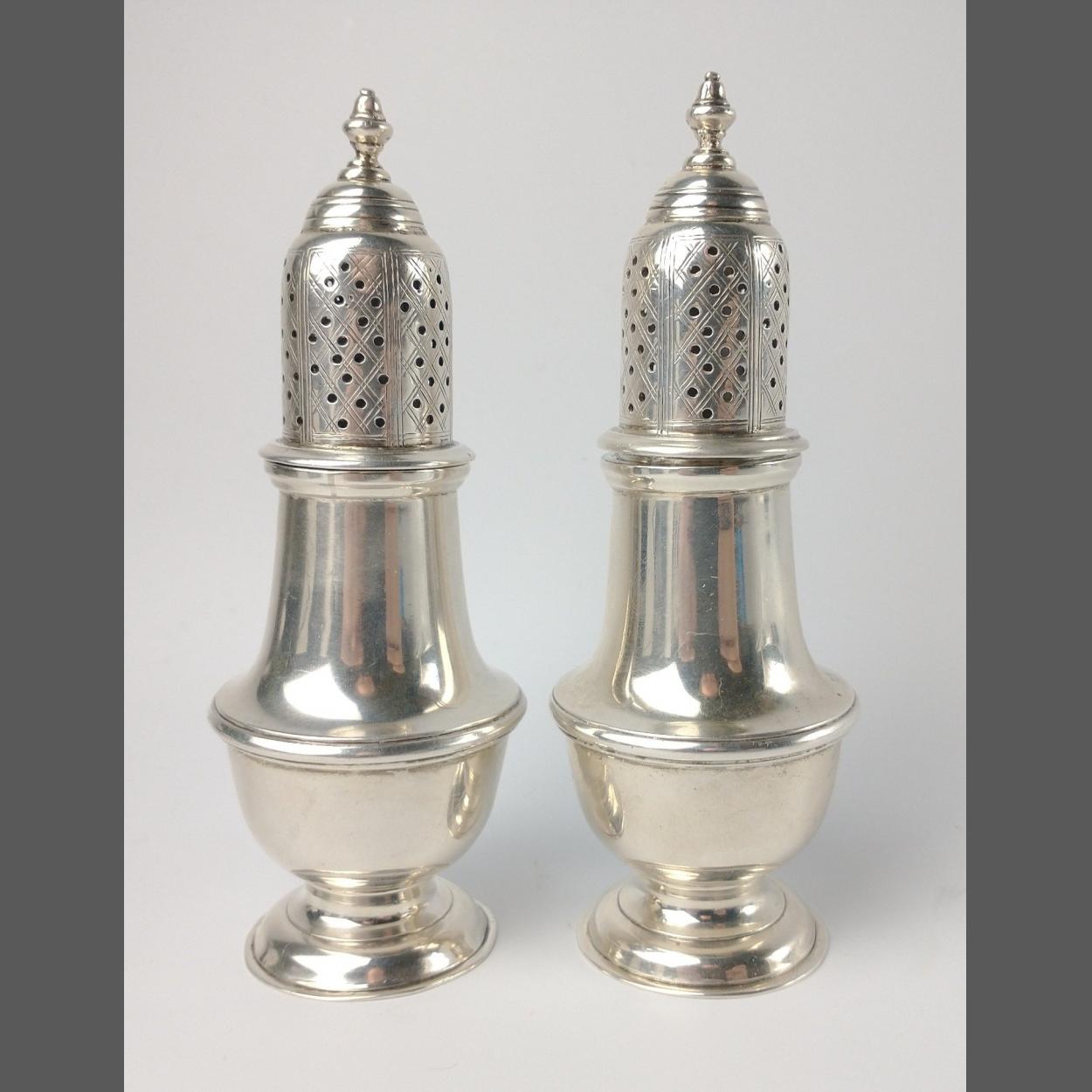 A pair of solid silver substantial SIFTER CASTER hallmarked Chester 1936 Lowe & Sons, gross weight 270g Superb. Beautiful condition with minimal wear to marks on lids. Not filled so a hearty 270g plus combined. Stunning perfectly match pair that display beautifully. Each stands 14cm high.