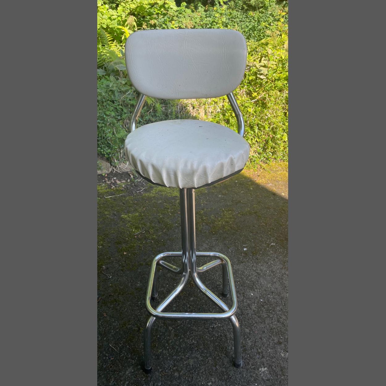 A retro 1970's cream leatherette and stainless steel bar stool (100cmH x 37cmW) and a retro swivel footstool in beige vinyl (68cm L x 55cmD)