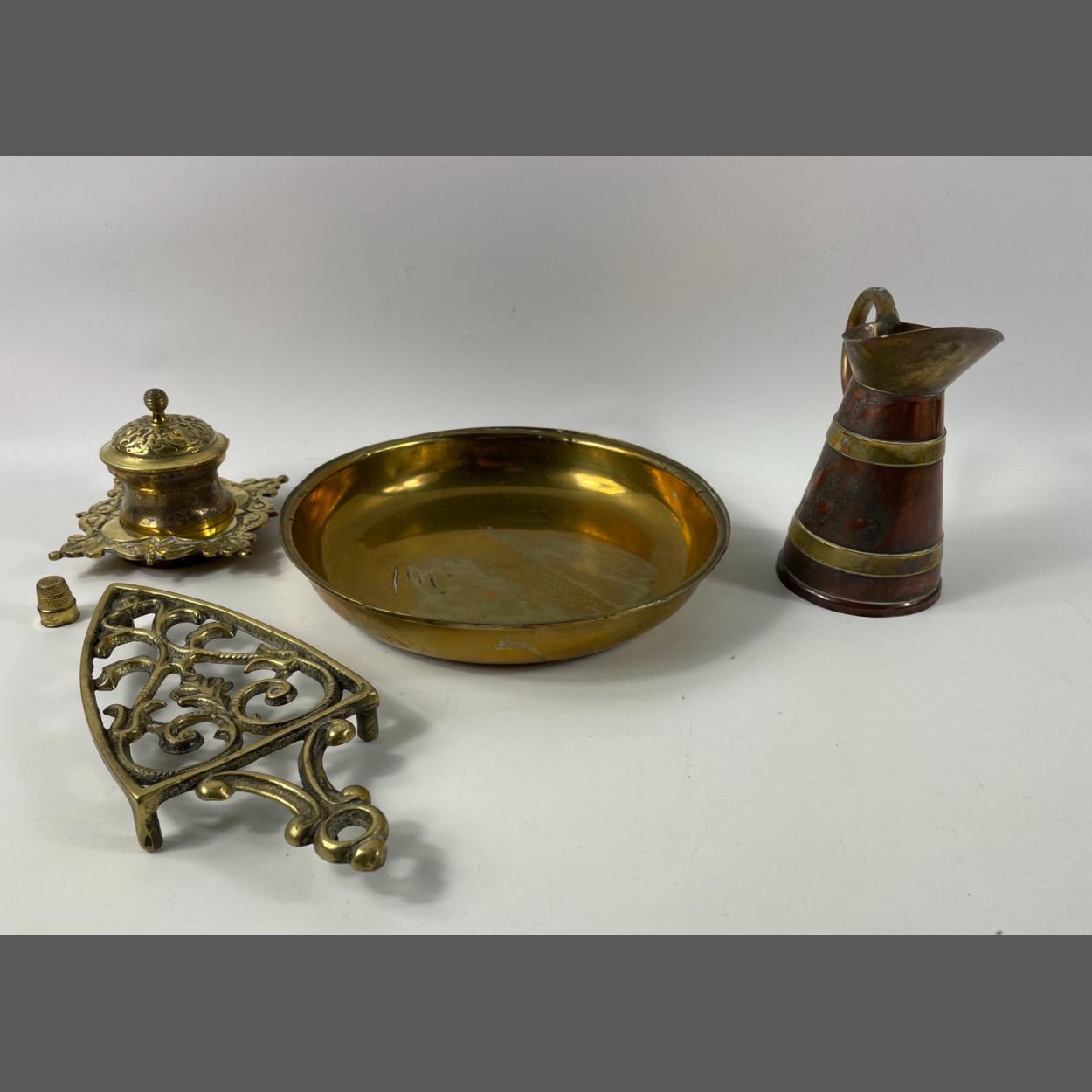 A collection of brass and copper to include a flat iron trivet (21cm long), a brass inkwell (approx 9cm tall), a thimble, a bowl and a small copper jug