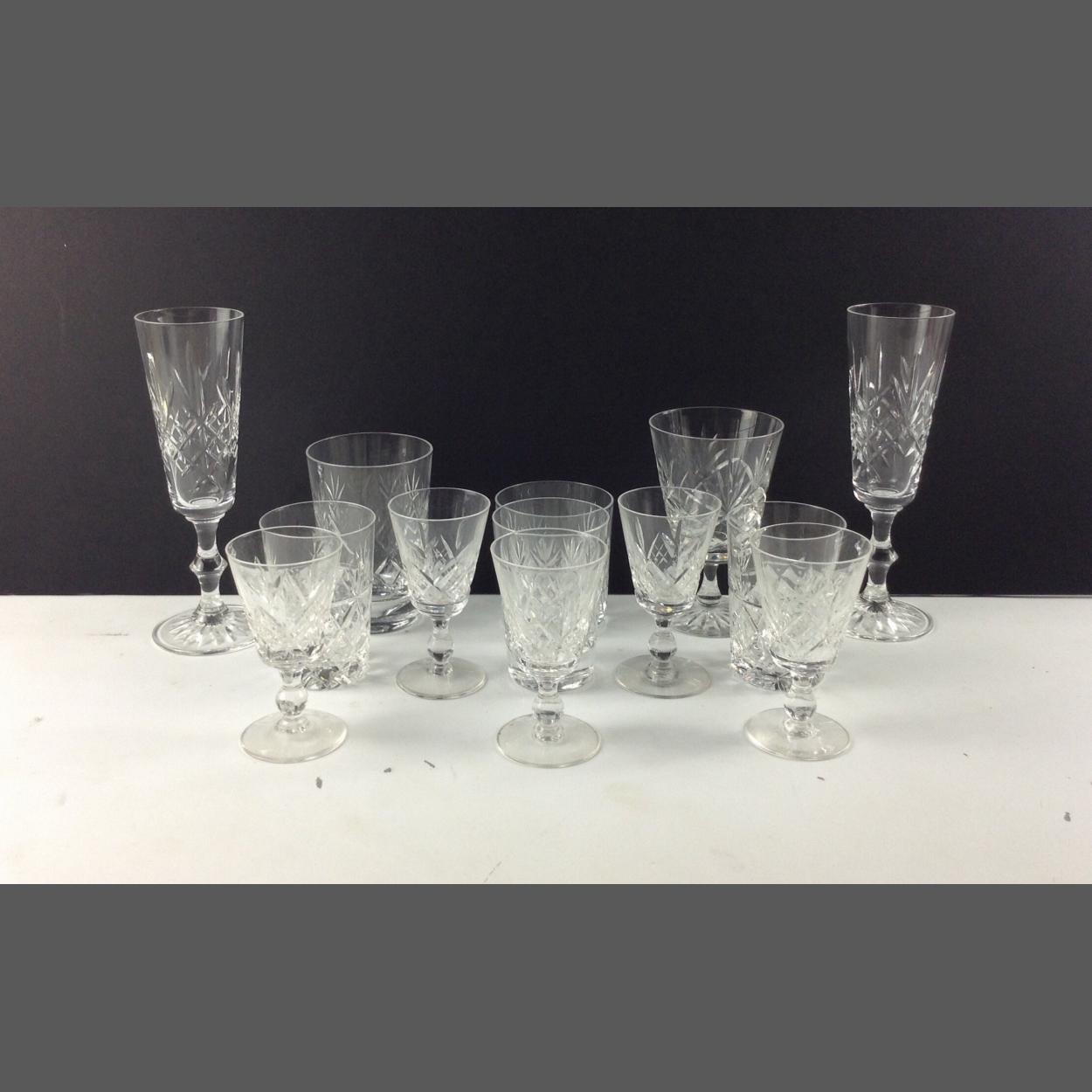 A mixed glassware collection with some crystal to include a pair of champagne flutes, a pair of small whisky tumblers, 5 sherry glasses etc